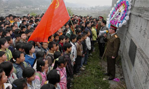 4月5日,在貴州省遵義縣南白鎮(zhèn)后壩紅軍烈士墓,遵義縣人武部政委朱松山(右)正在給后壩長(zhǎng)征希望學(xué)校的學(xué)生講述紅軍長(zhǎng)征的故事! ⌒氯A社記者