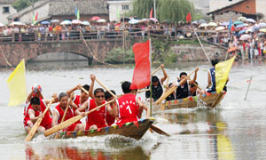 6月19日,農(nóng)民代表隊(duì)激烈角逐。當(dāng)日,在浙江省蘭溪市赤溪街道楊塘楊大湖,附近九個(gè)村莊的農(nóng)民進(jìn)行端午龍船賽。 。ū緢(bào)資料照片)