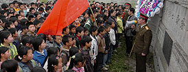 | 遵義縣人武部政委朱松山(右)正在給后壩長征希望學(xué)校的學(xué)生講述紅軍長征的故事。 |