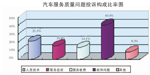 2007年三季度,全國汽車售后服務(wù)質(zhì)量投訴表明,服務(wù)收費、服務(wù)態(tài)度和配件供應(yīng)在服務(wù)質(zhì)量投訴中占到70%以上。 同一故障在反復(fù)修理過程中,消費者對工時等費用該由誰承擔(dān)的反映仍十分突出;而配件方面的投訴主要表現(xiàn)在配件供應(yīng)的及時性、配件價格過高及質(zhì)量不能保證等方面。 其中,對服務(wù)質(zhì)量的投訴反映較多的主要是維修養(yǎng)護(hù)時的配件問題,占40.5%。其問題主要表現(xiàn)為以次充好,質(zhì)量不過關(guān)等。