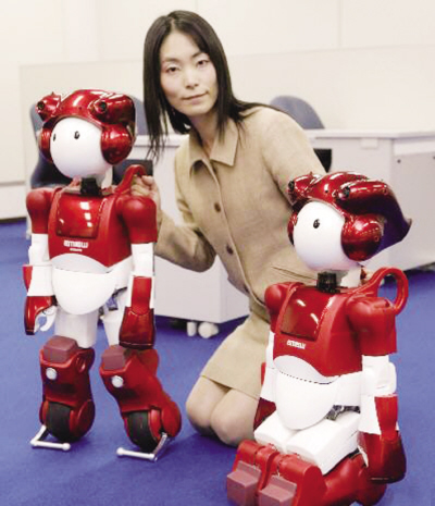 在日本茨木的日立公司實(shí)驗(yàn)室,工作人員展示該公司新研制出的“EMIEW2”機(jī)器人。它們不僅同上一代一樣擁有卓越的靈活性,能夠與人協(xié)同工作,而且新增了可變的“腿腳”,能夠在車輪和雙足之間自由交換。