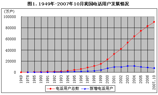 一、電話用戶發(fā)展概況 2007年10月,我國電話用戶總數(shù)突破9億戶大關(guān),達(dá)到90213.0萬戶,其中固定電話用戶37068.3萬戶,移動電話用戶53144.7萬戶。固定電話和移動電話的用戶規(guī)模均保持世界首位。 1949年建國之初,我國僅有固定電話用戶21.8萬戶。改革開放以前,我國電話用戶的發(fā)展幾乎是停滯不前的,從1949年到1978年這29年間,我國電話用戶僅增長了170.8萬戶。上世紀(jì)八、九十年代,我國電話用戶加速發(fā)展,新增電話用戶逐年增加。進(jìn)入新千年以來,我國電話用戶高速穩(wěn)定增長,大約每年新增1億戶電話用戶。