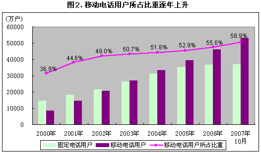 二、電話用戶的構(gòu)成 。ㄒ唬┮苿与娫捰脩舯3指咚僭鲩L 2007年10月,我國移動電話用戶新增813.2萬戶,刷新單月增長紀(jì)錄。2003年10月,移動電話用戶數(shù)首次超過固定電話用戶數(shù),到2007年10月,移動電話用戶數(shù)與固定電話用戶數(shù)的差距拉大到16076.4萬戶,移動電話用戶在電話用戶總數(shù)中所占的比重達(dá)到58.9%。