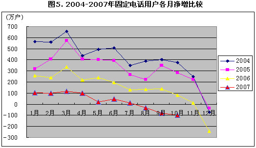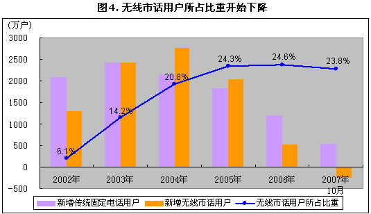 。ǘ┕潭娫捰脩舫霈F(xiàn)減少趨勢 2007年8-10月,固定電話用戶連續(xù)三個月減少,主要是由于無線市話用戶大幅減少所致。2007年1-10月,傳統(tǒng)固定電話用戶增加了540.0萬戶,而無線市話用戶減少了250.2萬戶。2007年10月,無線市話用戶降至8812.8萬戶,在固定電話用戶中所占的比重為23.8%,分別比歷史月度最高值下降了528.7萬戶和1.5個百分點(diǎn)。