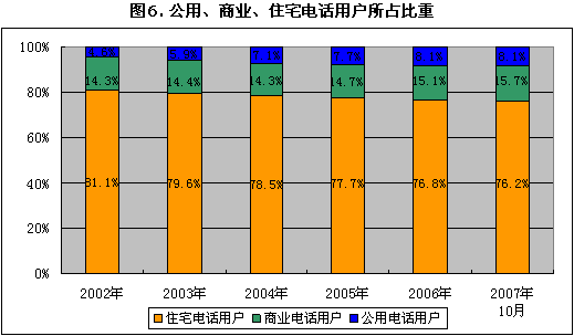 。ㄈ┳≌娫捰脩舯戎刂饾u下降 從近幾年的變化情況來看,商業(yè)電話用戶、公用電話用戶發(fā)展較快,所占的比重也逐年上升。到2006年底,我國每千人所擁有的公用電話數(shù)已經(jīng)達(dá)到22.6部。住宅電話用戶雖然仍是我國固定電話用戶的主體,但其所占的比重逐年下降。