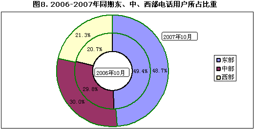 三、電話用戶的分布 。ㄒ唬┲、西部地區(qū)電話用戶所占比重上升 2007年10月,東、中、西部地區(qū)電話用戶分別比上年同期增長8.5%、10.9%、13.0%,中、西部地區(qū)電話用戶所占比重分別比上年同期上升了0.2、0.6個百分點(diǎn),與東部地區(qū)的差距進(jìn)一步縮小。