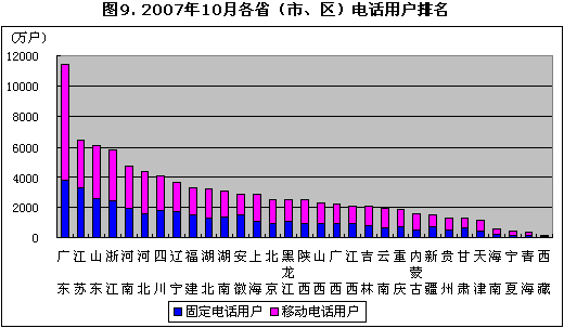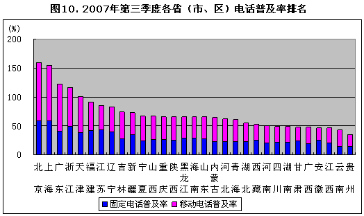 。ǘ└魇。ㄊ、區(qū))電話用戶和普及率排名 從用戶來看,廣東省獨(dú)占鰲頭,其電話用戶總數(shù)已經(jīng)超過1億戶。江蘇、山東、浙江三省屬于第二集團(tuán),電話用戶總數(shù)在6000萬戶左右。 從普及率來看,2007年第三季度,我國電話普及率達(dá)到68.2部/百人,其中固定電話普及率28.3部/百人,移動電話普及率39.9部/百人。北京、天津、上海、廣東和浙江五省(市)的電話普及率都超過了100部/百人,其中北京的移動電話普及率超過100部/百人。