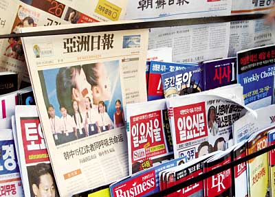 11月28日,韓國(guó)首份中文日?qǐng)?bào)《亞洲日?qǐng)?bào)》出現(xiàn)在韓國(guó)首都首爾的一個(gè)報(bào)刊亭。當(dāng)日,韓國(guó)第一份由韓國(guó)人主辦的中文日?qǐng)?bào)《亞洲日?qǐng)?bào)》正式發(fā)行,該報(bào)的問(wèn)世打破了韓國(guó)外文報(bào)刊由英文一統(tǒng)天下的局面。 | |