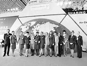 | 圖為星空聯(lián)盟成員航空公司的空姐首次大規(guī)模地亮相北京(宋朋 陳煜儒