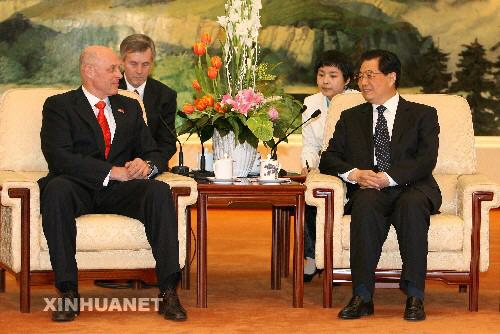 國(guó)家主席胡錦濤13日下午在人民大會(huì)堂會(huì)見(jiàn)了來(lái)華參加第三次中美戰(zhàn)略經(jīng)濟(jì)對(duì)話的美國(guó)總統(tǒng)布什的特別代表、財(cái)政部長(zhǎng)保爾森等美方代表團(tuán)主要成員。