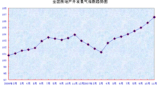 11月份,“國房景氣指數(shù)”為106.59,比10月份上升0.85點,同比上升2.67點。 房地產(chǎn)開發(fā)投資分類指數(shù)為104.53,比10月份上升0.11點,同比上升3.07點。1-11月份,全國完成房地產(chǎn)開發(fā)投資21632億元,同比增長31.8%。住宅完成投資15440億元,增長33.7%。其中,經(jīng)濟適用住房投資693億元,增長31.7%。 資金來源分類指數(shù)為107.93,比10月份上升3.03點,同比上升4.63點。1-11月份,全國房地產(chǎn)開發(fā)企業(yè)資金來源為32043億元,增長40.8%。其中,國內(nèi)貸款為6098億元,增長32%;利用外資539億元,增長71.9%;企業(yè)自籌資金10272億元,增長38.5%。 土地開發(fā)面積分類指數(shù)為98.04,比10月份上升0.42點,同比回落3.49點。1-11月份,全國房地產(chǎn)開發(fā)企業(yè)完成土地開發(fā)面積2.14億平方米,增長8%。 房屋施工面積分類指數(shù)為105.54,比10月份下降0.10點,同比上升2.78點。1-11月份,全國房屋施工面積21.66億平方米,增長23.0%。其中,住宅施工面積17.11億平方米,增長24.2%;辦公樓施工面積7930萬平方米,增長18.4%;商業(yè)營業(yè)用房施工面積2.39億平方米,增長12.4%。 商品房空置面積分類指數(shù)為111.97,比10月份上升1.26點,同比上升6.54點。截止到11月末,全國商品房空置面積為11797萬平方米,同比下降4.5%。其中,空置商品住宅5766萬平方米,下降14.2%。