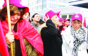 1月16日,德國波鴻,諾基亞員工在示威游行時哭泣。