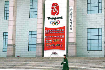 中國(guó)國(guó)家博物館門(mén)前的2008年奧運(yùn)會(huì)倒計(jì)時(shí)牌顯示距北京奧運(yùn)會(huì)開(kāi)幕還有200天。 新華社記者 高學(xué)余