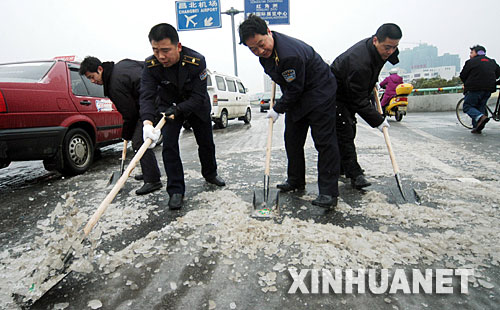 1月26日,城管執(zhí)法人員在南昌八一大橋上鏟除冰雪。