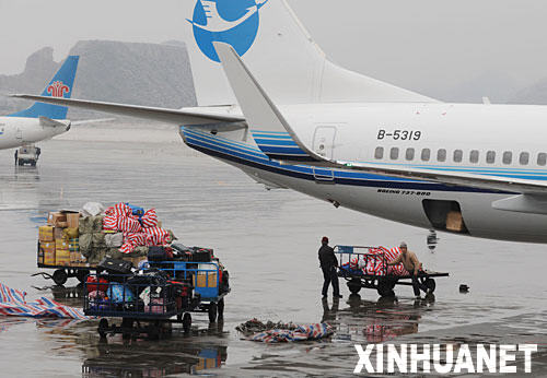1月27日,貴陽龍洞堡機(jī)場(chǎng)工作人員抓緊時(shí)間為客機(jī)卸貨。