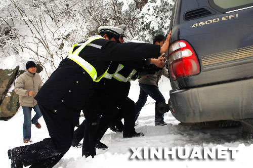 1月24日,安徽省岳西縣幾位民警在推陷入積雪的汽車。近日,位于大別山區(qū)的安徽省岳西縣出現(xiàn)有歷史記錄以來最大降雪,造成全縣道路中斷。大雪過后,該縣縣直機(jī)關(guān)、各鄉(xiāng)鎮(zhèn)、村積極行動起來,開展除雪工作,盡全力保證道路暢通。 新華社記者 李健 攝