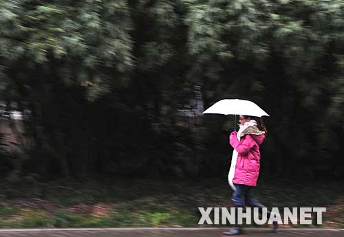 1月28日,一位女士在雨雪中行走。