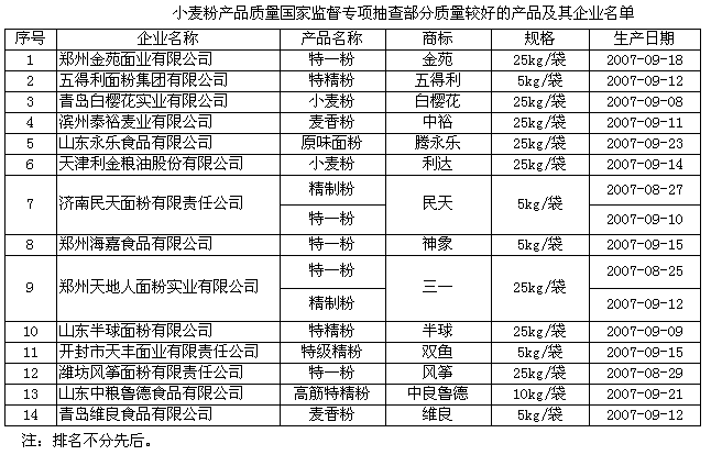 為維護(hù)消費者的合法權(quán)益,促進(jìn)小麥粉行業(yè)健康發(fā)展,春節(jié)前夕,國家質(zhì)檢總局組織對部分“年貨”食品進(jìn)行了國家監(jiān)督專項抽查。其中,小麥粉產(chǎn)品共抽查了北京、天津、河南、河北、山東、內(nèi)蒙古、寧夏等7個省、直轄市55家企業(yè)生產(chǎn)的60種產(chǎn)品(不涉及出口產(chǎn)品),產(chǎn)品實物質(zhì)量抽樣合格率為100%。