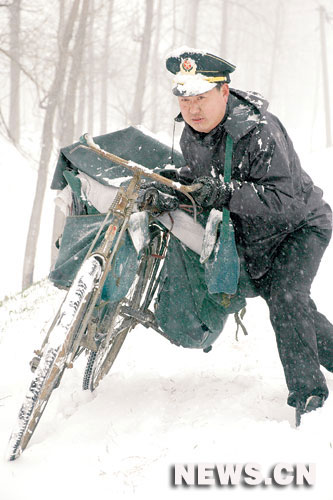 河南商水縣投遞員周學(xué)長(zhǎng)送郵途中。