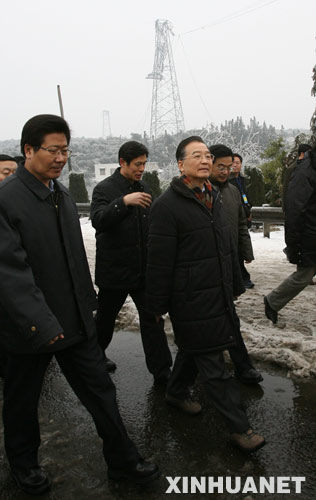 1月29日,中共中央政治局常委、國務(wù)院總理溫家寶在湖南湘潭市郊外查看電力設(shè)施受損情況。