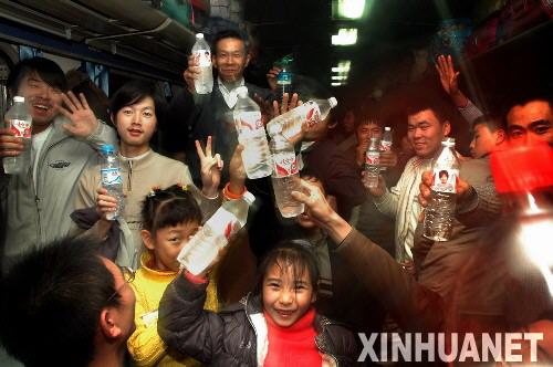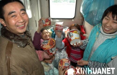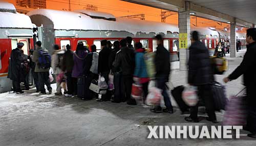 1月28日,在合肥火車站,旅客在排隊(duì)上車。 當(dāng)日凌晨3點(diǎn),由合肥開往成都1432/1433次列車,因大雪晚點(diǎn)4小時后進(jìn)入站臺,記者隨旅客隊(duì)伍一起登上這趟列車,一線感受春運(yùn)。開車后,各車廂列車員為旅客及時供應(yīng)開水,廣播員多次為列車晚點(diǎn)向旅客致歉,列車長和乘警走進(jìn)硬座車廂檢查“三品”。車廂外天寒地凍,車廂內(nèi)暖意融融。新華社記者 陶明 攝