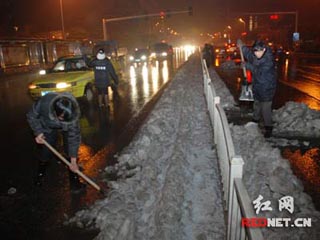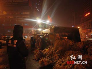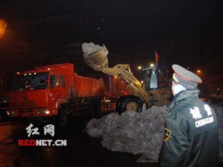 紅網(wǎng)1月31日訊 從昨(30日)晚10點(diǎn)開始,一場(chǎng)清除道路積雪的攻堅(jiān)戰(zhàn)在長(zhǎng)沙打響,由長(zhǎng)沙市城管局協(xié)調(diào)組織的6000人、300多臺(tái)運(yùn)輸車輛、40多臺(tái)鏟車一起上路,對(duì)長(zhǎng)沙市二環(huán)線內(nèi)8條主干道上的積雪實(shí)行定點(diǎn)清除。 晚9點(diǎn)半,長(zhǎng)沙市開福區(qū)由城管隊(duì)員、民兵、基層干部、環(huán)衛(wèi)工人組成的1000多名“戰(zhàn)士”集合完畢,隨后迅速拿著鐵锨等工具進(jìn)入戰(zhàn)斗狀態(tài)!皬南卵┢穑覀円呀(jīng)連續(xù)干了十幾天了,天氣不轉(zhuǎn)好,我們決不休息!杯h(huán)衛(wèi)工人楊大姐說。 10點(diǎn)半,雪花夾雜著雪籽突然從天而降,這給正在緊張有序清除積雪的“戰(zhàn)士”們帶來了不小的麻煩,短短十幾分鐘,剛清理完畢的路面又出現(xiàn)了一層薄薄的白色!皯(zhàn)士”們加快了速度,沿芙蓉路一線,隨時(shí)可以見到鏟車和渣土車,隨時(shí)可以聽到鐵锨與路面摩擦的聲音。 11點(diǎn),長(zhǎng)沙市委常委、副市長(zhǎng)徐湘平和市城管局局長(zhǎng)袁志恒出現(xiàn)在五一路袁家?guī)X立交橋一處清除積雪的現(xiàn)場(chǎng),進(jìn)行現(xiàn)場(chǎng)辦公。 “昨晚我們花了一個(gè)通宵的時(shí)間把路面上的積雪鏟倒了路邊,今晚一定要把這些成堆的積雪清理掉,只有這樣才能保證在可能出現(xiàn)的下一場(chǎng)雪落下來之前把‘遺留問題’解決。”袁志恒的聲音略顯疲憊。而在一旁,芙蓉區(qū)城管大隊(duì)隊(duì)長(zhǎng)劉湘麓則用沙啞的聲音指揮著“戰(zhàn)友”們戰(zhàn)斗,這十多天來,他每天睡的時(shí)間都沒超過3個(gè)小時(shí)。 今天凌晨1點(diǎn),長(zhǎng)沙市的五一路、芙蓉路、韶山路等主干道許多路段的積雪已經(jīng)被清除了,而戰(zhàn)斗依然在繼續(xù)……
