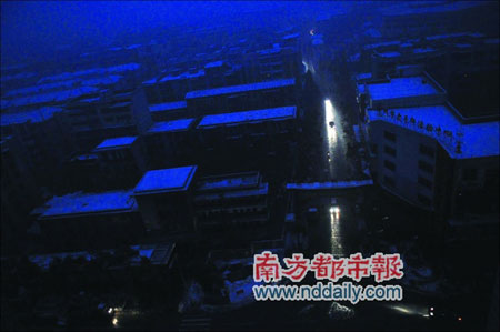 入夜以后,湖南郴州市區(qū)一片漆黑,這個(gè)城市已經(jīng)連續(xù)停電停水6天。 張志韜 攝 |