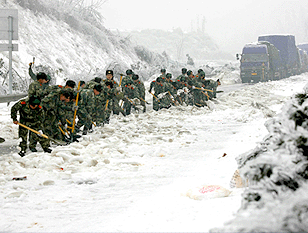 2月3日,武警官兵在京珠高速公路湖南段鏟雪。 經(jīng)過解放軍和武警官兵連續(xù)幾天持續(xù)不斷地破冰鏟雪,京珠高速公路湖南段于當(dāng)日15時40分基本貫通。 為盡快打通京珠大動脈,武警駐湖南某部出動了1200多名官兵日夜奮戰(zhàn)在京珠高速公路破冰鏟雪、維持交通秩序。廣州軍區(qū)某部出動3臺裝甲牽引車和2臺故障搶修車,在高速公路冰凍層最厚的地段輾冰除雪。 | |