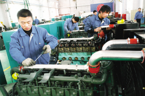 2月10日,在山東濰柴動力發(fā)電機組組裝車間內,工人們正在緊張組裝發(fā)電機組。自1月中旬南方地區(qū)出現雪災開始,濰柴動力集團已將300多臺發(fā)電機組發(fā)送湖南、廣東、廣西、貴州等受災地區(qū),以緩解南方電力供應異常緊張的局面。CFP圖片