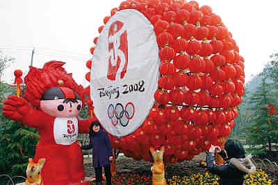 2月11日,一組由數(shù)百個紅燈籠和福娃組成的大型彩燈吸引了市民的目光。春節(jié)及元宵節(jié)期間,江蘇南通園藝博覽園、狼山景區(qū)等地推出的多組奧運主題的花燈受到市民的歡迎。