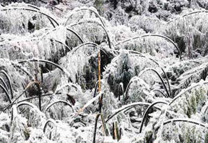 核心提示 雨雪冰凍災(zāi)害肆虐南國(guó)大地。1月下旬以來(lái),雪凝導(dǎo)致貴州銅仁地區(qū)萬(wàn)山特區(qū)斷水?dāng)嚯姡煌òc瘓,通訊隔絕;在福建,50年不遇的嚴(yán)重冰凍災(zāi)害襲擊武夷山區(qū),沿線8縣遭創(chuàng),林業(yè)受災(zāi)最重。據(jù)不完全統(tǒng)計(jì),福建林業(yè)直接經(jīng)濟(jì)損失目前已超過(guò)50億元。