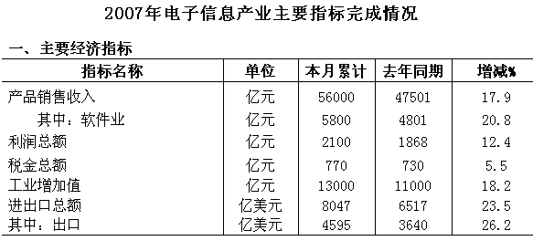 2007年,電子信息全行業(yè)在黨中央、國務(wù)院的正確領(lǐng)導(dǎo)下,堅(jiān)持以科學(xué)發(fā)展觀為指導(dǎo),認(rèn)真貫徹落實(shí)國家戰(zhàn)略部署和宏觀調(diào)控措施,積極應(yīng)對技術(shù)業(yè)務(wù)轉(zhuǎn)型升級和宏觀政策環(huán)境變化的新形勢,不斷推動結(jié)構(gòu)調(diào)整和自主創(chuàng)新,積極拓展國內(nèi)外市場,使產(chǎn)業(yè)經(jīng)濟(jì)運(yùn)行呈現(xiàn)平穩(wěn)發(fā)展態(tài)勢,為國民經(jīng)濟(jì)和社會發(fā)展做出了新的貢獻(xiàn)。