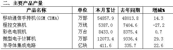 。ㄒ唬┊a(chǎn)業(yè)規(guī)模不斷擴(kuò)大 全年實(shí)現(xiàn)銷售收入5.6萬億元,增長18%;增加值13000億元,增長18.2%;軟件業(yè)務(wù)收入5800億元,增長20.8%。產(chǎn)業(yè)規(guī)模繼續(xù)在國民經(jīng)濟(jì)各行業(yè)中位居領(lǐng)先,銷售收入占全國工業(yè)的比重為12%,增加值占全國GDP的比重達(dá)5.27%。 。ǘ┙(jīng)濟(jì)效益穩(wěn)步提高 進(jìn)入二季度后,全行業(yè)經(jīng)濟(jì)效益開始扭轉(zhuǎn)負(fù)增長的局面,至12月底實(shí)現(xiàn)利稅2870億元。其中實(shí)現(xiàn)利潤2100億元,增長12.4%;稅收770億元,增長5.5%;二者增速比上半年提高2個(gè)百分點(diǎn)以上。計(jì)算機(jī)、家用視聽設(shè)備和電子器件行業(yè)效益情況較好,利潤增速達(dá)20%以上,成為拉動全行業(yè)效益增長的主要力量。 。ㄈ┊a(chǎn)品產(chǎn)銷銜接良好 多數(shù)重點(diǎn)產(chǎn)品產(chǎn)量保持平穩(wěn)增長,全年生產(chǎn)手機(jī)5.48億部,增長14%;微型計(jì)算機(jī)1.21億臺,增長29%;數(shù)碼相機(jī)7493.5萬臺,增長11.9%;集成電路產(chǎn)量412億塊,增長22.6%;彩色電視機(jī)8433萬臺,增長0.7%。產(chǎn)品產(chǎn)銷銜接良好,手機(jī)、計(jì)算機(jī)、彩電等主要產(chǎn)品產(chǎn)銷率均達(dá)98%以上。全行業(yè)產(chǎn)品庫存慢于收入增長,增速為17%,比收入增速低了1個(gè)百分點(diǎn)。 。ㄋ模⿲ν赓Q(mào)易增勢平穩(wěn) 全行業(yè)對外貿(mào)易額達(dá)到8047億美元,同比增長23.5%,占全國外貿(mào)總額的37%。出口4595億美元,增長26.2%,增速比全國出口高了0.5個(gè)百分點(diǎn),占全國出口總額的比重為37.7%。進(jìn)口3452億美元,增長20%,占全國進(jìn)口總額的比重為36.1%。出口較快的主要是計(jì)算機(jī)和電子元件行業(yè),二者增速分別比全行業(yè)高了2.8和10.8個(gè)百分點(diǎn)。 (五)固定資產(chǎn)投資繼續(xù)擴(kuò)大 全行業(yè)500萬元以上投資項(xiàng)目累計(jì)完成投資2646億元,同比增長27.9%;本年新增固定資產(chǎn)1477億元,增長9.2%。本年新開工項(xiàng)目2780個(gè),同比增長10.2%;新開工項(xiàng)目的計(jì)劃投資總額為2303億元,增長34.9%;新開工項(xiàng)目主要來自電子元器件領(lǐng)域,二者新開工項(xiàng)目超過1300項(xiàng),占全行業(yè)的一半左右。 。┢髽I(yè)實(shí)力不斷增強(qiáng) 全行業(yè)規(guī)模以上企業(yè)共有27569家,其中制造業(yè)14601家,軟件業(yè)12968家。企業(yè)經(jīng)濟(jì)規(guī)模不斷擴(kuò)大,全年電子信息百強(qiáng)企業(yè)完成營業(yè)收入超過1萬億元,實(shí)現(xiàn)利稅超過500億元,出口交貨值增長20%以上,日益成為推動行業(yè)平穩(wěn)運(yùn)行的中堅(jiān)力量。 。ㄆ撸┛萍紕(chuàng)新日趨深入 新品開發(fā)穩(wěn)步增長,全行業(yè)新品產(chǎn)值率超過20%,比上年提高了0.2個(gè)百分點(diǎn)。企業(yè)研發(fā)投入不斷提高,全行業(yè)研發(fā)投入超過1000億元,電子信息百強(qiáng)企業(yè)研發(fā)投入占銷售收入比重接近4%,其中有11家企業(yè)比例已超過6%,海爾、華為等研發(fā)投入均超過50億元。 。ò耍﹨^(qū)域布局日益集中 九個(gè)國家信息產(chǎn)業(yè)基地實(shí)現(xiàn)收入超過3萬億元,成為引領(lǐng)產(chǎn)業(yè)增長的重要地區(qū),并在結(jié)構(gòu)調(diào)整、技術(shù)創(chuàng)新、產(chǎn)業(yè)配套、外貿(mào)出口、人才就業(yè)等方面發(fā)揮重要的帶動示范效應(yīng)。40個(gè)國家電子信息產(chǎn)業(yè)園,分別在通信、計(jì)算機(jī)、家電、集成電路、電子元件、電子器件、電子材料等專業(yè)領(lǐng)域處于全國領(lǐng)先地位,合計(jì)產(chǎn)業(yè)規(guī)模占全國的1/4以上。 。ň牛┠茉聪奶幱谳^低水平 全年規(guī)模以上制造業(yè)消耗標(biāo)準(zhǔn)煤1476萬噸,每萬元增加值消耗標(biāo)準(zhǔn)煤0.164噸,比上年下降1.2%,約等于國民經(jīng)濟(jì)和工業(yè)平均水平的15%和7%。其中能耗排在前面的小行業(yè)分別是電子真空器件(1.13噸)、電光源(0.61噸)、印制電路板(0.38噸)、信息化學(xué)材料(0.37噸)、光纖光纜(0.36噸)。從能源產(chǎn)品看,電力、原煤、燃料油、柴油占據(jù)前四位,分別占全行業(yè)能源消耗量的49%、15%、11%、10%。 (十)信息化程度進(jìn)一步提高 全國手機(jī)普及率達(dá)到41.6%,比上年增加了6.3個(gè)百分點(diǎn);互聯(lián)網(wǎng)用戶達(dá)到2.1億人,比上年增長7000萬人以上;城鎮(zhèn)居民計(jì)算機(jī)擁有量達(dá)到59.7臺/百戶,彩電擁有量超過151臺/百戶,二者分別比上年提高了15%和5%。國家信息化投資占城市基礎(chǔ)設(shè)施投資的比重接近10%,電子政務(wù)投入在電信建設(shè)投入的比重為12%。企業(yè)電子商務(wù)不斷推進(jìn),電子大中型企業(yè)電子商務(wù)采購、銷售額占營業(yè)額的比重達(dá)40%。 。ㄊ唬⿵臉I(yè)人數(shù)不斷增加 全年規(guī)模以上電子信息產(chǎn)業(yè)就業(yè)人數(shù)達(dá)到777萬人,其中制造業(yè)675萬人,軟件業(yè)102萬人;二者合計(jì)比上年增加了53萬人,占全國城鎮(zhèn)新增就業(yè)人數(shù)的5%,其中制造業(yè)新增就業(yè)人數(shù)占全國工業(yè)的比重為10%。 。ㄊ┊a(chǎn)品價(jià)格呈下降趨勢 2007年,我國主要消費(fèi)類電子產(chǎn)品價(jià)格指數(shù)為85.2,降幅較上年增加了0.7個(gè)百分點(diǎn),比全國CPI低19.6個(gè)百分點(diǎ