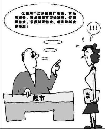 某商貿(mào)公司是一家經(jīng)營(yíng)了20多年的企業(yè),與天津市所有超市都有業(yè)務(wù)往來。該企業(yè)主管讓我們翻閱了部分賬目和合同文本后說:“你們看看這些資料就明白了,亂收費(fèi)的超市起初只有家樂福一家,現(xiàn)在幾乎所有超市都在效仿,收費(fèi)名目越來越多,真讓人難以承受! 我們隨手翻閱了該公司去年和家樂福簽訂的一份合同,其中有如下收費(fèi)條目:無條件折扣費(fèi)、有條件折扣費(fèi)、DM廣告費(fèi)、咨詢服務(wù)費(fèi)、共同商品服務(wù)費(fèi)、節(jié)假日促銷費(fèi)、新品進(jìn)場(chǎng)費(fèi)、免費(fèi)樣品、新店開業(yè)促銷費(fèi)等。在與天津樂購(gòu)超市簽訂的合同中,除上述條款外,還有全國(guó)周年店慶促銷廣告費(fèi)、商品展銷費(fèi)、商品質(zhì)量商店檢驗(yàn)費(fèi)等。該公司業(yè)務(wù)主管說:“這些是寫在合同上的,沒寫的收費(fèi)名目還很多,比如貢獻(xiàn)費(fèi)、價(jià)外支持費(fèi)、重裝贊助費(fèi)等!蔽覀儐枺骸斑@些收費(fèi)合理嗎?”財(cái)務(wù)人員氣憤地說:“哪兒合理呀!他們收哪項(xiàng)費(fèi)用都不敢給我們開發(fā)票,要么給虛假的購(gòu)貨發(fā)票,要么讓用貨物抵扣,不僅收了錢還逃了稅! 我們找有代表性的部分產(chǎn)品供貨廠商座談,大家都叫苦不迭。一個(gè)大型商貿(mào)企業(yè)的負(fù)責(zé)人說:“超市這些年做事越來越過分。沃爾瑪剛進(jìn)中國(guó)時(shí),幾乎不收什么費(fèi)用,后來從家樂福跳槽過來一個(gè)高管,把沃爾瑪也帶壞了,居然做出了讓我們補(bǔ)交往年費(fèi)用的荒唐事。我們不給錢,就直接從貨款里扣,真是太霸道了!”