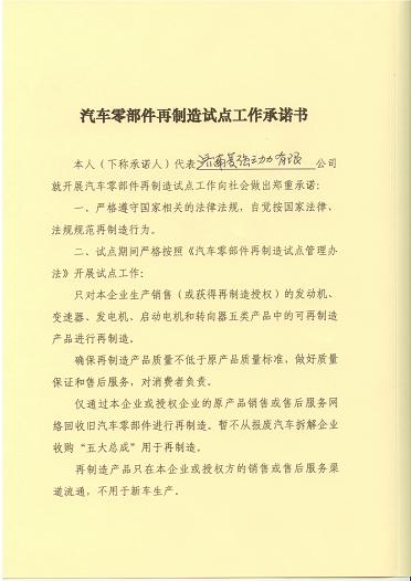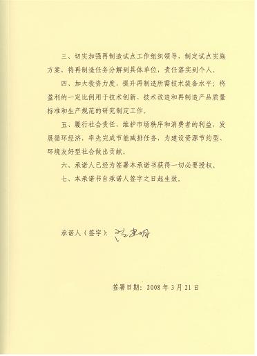 試點企業(yè)簽署并宣讀了《汽車零部件再制造試點工作承諾書》,向社會鄭重承諾在做好再制造試點工作的同時,履行社會責任,維護市場秩序和消費者的利益,發(fā)展循環(huán)經(jīng)濟,率先完成節(jié)能減排任務,為建設資源節(jié)約型、環(huán)境友好型社會做出貢獻。