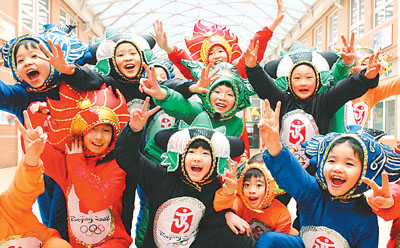 3月21日,“奧運(yùn)志愿心樂(lè)團(tuán)”來(lái)到北京市崇文小學(xué),與孩子們一起喜迎圣火,熱盼奧運(yùn)。圖為由孩子們組成的福娃造型輪滑隊(duì)表演《來(lái)吧2008》。