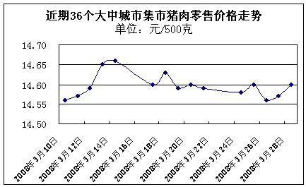 據(jù)國(guó)家發(fā)展改革委價(jià)格監(jiān)測(cè)中心監(jiān)測(cè),上周(2008.3.24-2008.3.28,下同)全國(guó)36個(gè)大中城市集市豬肉(精瘦肉)平均零售價(jià)格每500克為14.58元,比前一周(2008.3.17-2008.3.21,下同)下降0.14%。