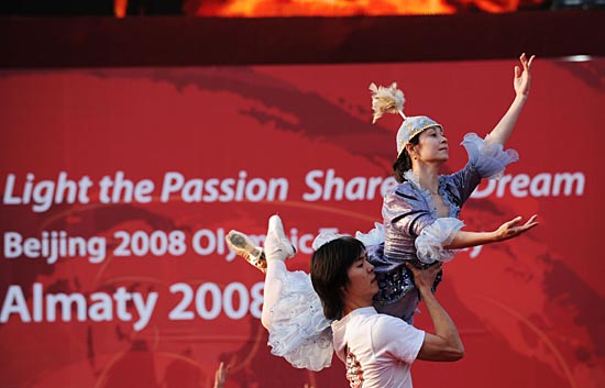4月1日,參加火炬接力城市慶典活動(dòng)的演員在進(jìn)行排練。當(dāng)日,北京奧運(yùn)會(huì)圣火到達(dá)全球傳遞的第一站——阿拉木圖。