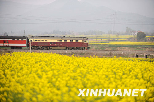 4月1日,一列火車從湖北省京山縣盛開(kāi)的油菜花旁駛過(guò)。