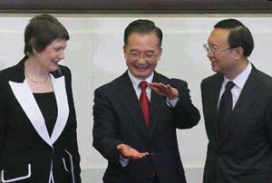| 中國國務(wù)院總理溫家寶(中)、新西蘭總理克拉克(左)、中國外交部部長楊潔篪(右)出席簽字儀式。新華/路透圖 | 《中國政府和新西蘭政府自由貿(mào)易協(xié)定》昨天(4月7日)正式簽署。這是中國與其他國家簽署的第一個(gè)全面的自由貿(mào)易協(xié)定,也是我國與發(fā)達(dá)國家達(dá)成的第一個(gè)自由貿(mào)易協(xié)定。