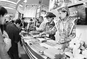 | 內(nèi)蒙古展位前的工作人員向參觀者發(fā)放資料。新華社記者 焦衛(wèi)平