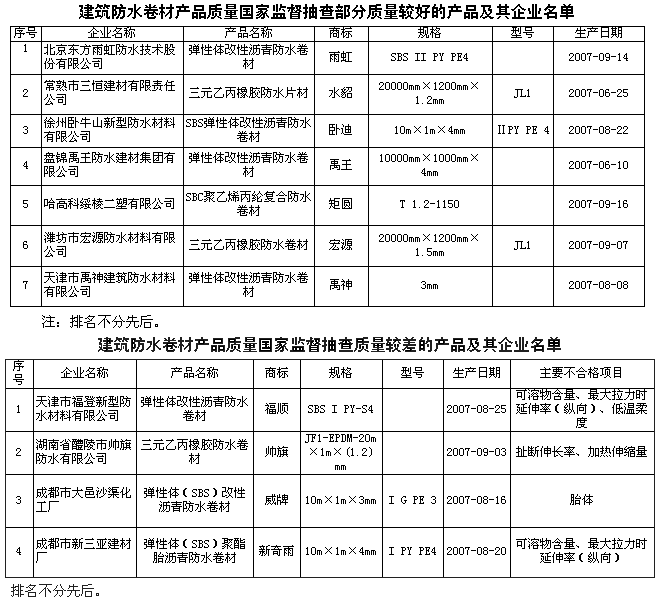 為保障建筑工程材料產(chǎn)品質(zhì)量,維護(hù)消費(fèi)者的合法權(quán)益,促進(jìn)建筑防水卷材行業(yè)健康發(fā)展,國(guó)家質(zhì)檢總局組織對(duì)建筑防水卷材產(chǎn)品質(zhì)量進(jìn)行了國(guó)家監(jiān)督抽查,共抽查了北京、河北、天津、遼寧、吉林、黑龍江、河南、湖南、湖北、四川、重慶、陜西、山東、安徽、江蘇、浙江、上海等17個(gè)省、直轄市81家企業(yè)生產(chǎn)的84種產(chǎn)品(不涉及出口產(chǎn)品),產(chǎn)品實(shí)物質(zhì)量抽樣合格率為94.6%。 此次抽查依據(jù)強(qiáng)制性國(guó)家標(biāo)準(zhǔn)GB18242-2000《彈性體改性瀝青防水卷材》、GB18173.1-2006《高分子防水材料