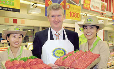澳大利亞農(nóng)業(yè)部長伯克日前抵達韓國,推動進一步的雙邊貿(mào)易和推廣澳大利亞農(nóng)產(chǎn)品。圖為伯克(中)在韓國首爾一家零售店推銷澳大利亞產(chǎn)牛肉。新華社/法新