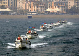 4月13日,特警隊(duì)員駕駛高速摩托艇在青島奧帆中心海域演練海上編隊(duì)課目。新華社記者:朱崢 攝