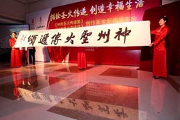 4月17日——北京奧運(yùn)會(huì)倒計(jì)時(shí)113天之際,中國(guó)文體明星北京奧運(yùn)宣傳助威團(tuán)和北京奧運(yùn)會(huì)燃?xì)饩擢?dú)家供應(yīng)商中山華帝燃具股份有限公司在國(guó)家體育總局隆重召開(kāi)以?shī)W運(yùn)圣火傳遍中華大地為主題的書(shū)畫(huà)巨作《神州圣火傳遞圖》、《神州圣火傳遞頌》創(chuàng)作面世暨郵品發(fā)行新聞發(fā)布會(huì)。 《神州圣火傳遞圖》、《神州圣火傳遞頌》分別由113幅繪畫(huà)和113幅書(shū)法作品構(gòu)成的兩部巨作,表現(xiàn)了113個(gè)火炬?zhèn)鬟f城市的風(fēng)光、人文、地域特征,每幅均獨(dú)立成篇,組合起來(lái)就是完整的奧運(yùn)圣火傳遞路線。據(jù)統(tǒng)計(jì)本次共有書(shū)畫(huà)家逾300人參與了兩幅巨著的創(chuàng)作,征集書(shū)畫(huà)作品400多幅。