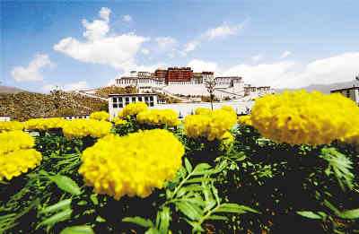 4月26日,西藏自治區(qū)拉薩市布達拉宮前花團錦簇。拉薩市園林部門在布達拉宮廣場及其周圍擺設(shè)或種植成千上萬株鮮花,迎接北京奧運會倒計時100天和“五一”勞動節(jié)。