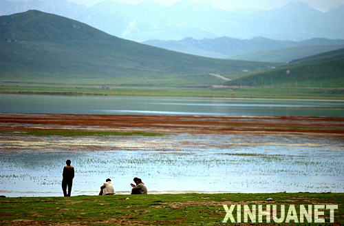 上圖為:幾位牧民正在甘肅省甘南藏族自治州碌曲縣尕海湖邊休息(2007年7月11日攝)。