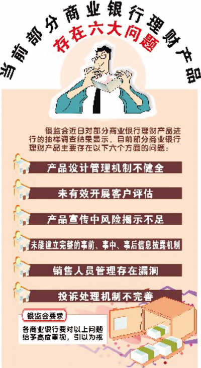 銀監(jiān)會對部分銀行理財產(chǎn)品進行了抽樣調(diào)查,發(fā)現(xiàn)部分銀行在開展理財業(yè)務(wù)的過程中存在較為嚴(yán)重的違規(guī)行為;核心是未嚴(yán)格且有效執(zhí)行相關(guān)法律法規(guī)和監(jiān)管規(guī)章。“部分商業(yè)銀行未能按照符合客戶利益和風(fēng)險承受能力的適應(yīng)性原則設(shè)計理財產(chǎn)品,沒有從資產(chǎn)配置的角度進行產(chǎn)品開發(fā)和投資組合設(shè)計,沒有應(yīng)用科學(xué)合理的測算方法預(yù)測理財投資組合的收益率,沒有設(shè)置相應(yīng)的市場風(fēng)險監(jiān)測指標(biāo)和有效的市場風(fēng)險識別、計量、監(jiān)測和控制體系! “產(chǎn)品設(shè)計管理機制不健全”是部分銀行個人理財產(chǎn)品的“第一宗罪”。同時,部分商業(yè)銀行在代理銷售其他金融機構(gòu)投資產(chǎn)品過程中,沒有對所代理產(chǎn)品進行充分分析,對產(chǎn)品提供者經(jīng)營管理、市場投資和風(fēng)險管理能力沒有進行有效評估,沒有明確界定雙方權(quán)利義務(wù)和風(fēng)險責(zé)任,對代理銷售產(chǎn)品的風(fēng)險收益監(jiān)測數(shù)據(jù)沒有進行必要驗證。 其后是“未有效開展客戶評估”。部分商業(yè)銀行沒有進行客戶風(fēng)險偏好評估工作,或評估工作流于形式;沒做到準(zhǔn)確了解客戶的財務(wù)狀況、投資目的、投資經(jīng)驗以及風(fēng)險認(rèn)知和承受能力;沒有評估客戶是否適合購買所推介的理財產(chǎn)品,并將有關(guān)評估意見告知客戶。 同時“產(chǎn)品宣傳中風(fēng)險揭示不足”。部分商業(yè)銀行“未能建立完整的事前、事中、事后信息披露機制”;未及時通過有效渠道和方式向客戶告知相關(guān)情況,特別是在理財產(chǎn)品存續(xù)期內(nèi),未能很好地向客戶提供方便、及時、準(zhǔn)確的資產(chǎn)變動、期末資產(chǎn)估值等重要信息。 此外,部分商業(yè)銀行對理財產(chǎn)品銷售人員的管理存在漏洞;而且投訴處理機制不完善。主要表現(xiàn)為部分商業(yè)銀行沒有對本行理財產(chǎn)品銷售人員進行有效管理,沒有建立相應(yīng)的個人理財業(yè)務(wù)人員資格考核與認(rèn)定、繼續(xù)培訓(xùn)、跟蹤評價等管理制度。缺乏專門的人員和部門及時處理客戶投訴,客戶投訴情況分析研究不足,對于客戶投訴較多的理財業(yè)務(wù)環(huán)節(jié)和理財產(chǎn)品不能及時有效地解決和改正。
