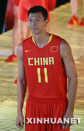 圖為中國男籃隊(duì)員易建聯(lián)在展示新的比賽服裝。 | |