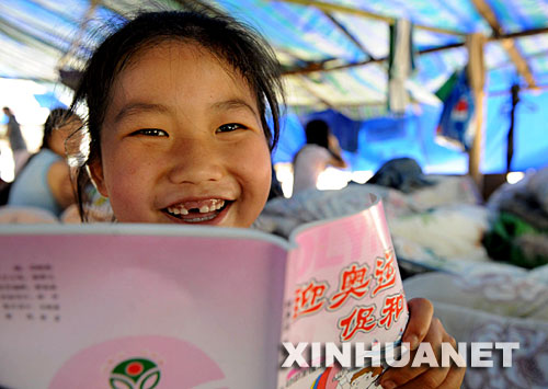 5月18日,四川青川縣喬莊鎮(zhèn)學生慧文在帳篷里閱讀有關奧運的書籍。她盼望地震不要影響了她看北京奧運會的電視實況。